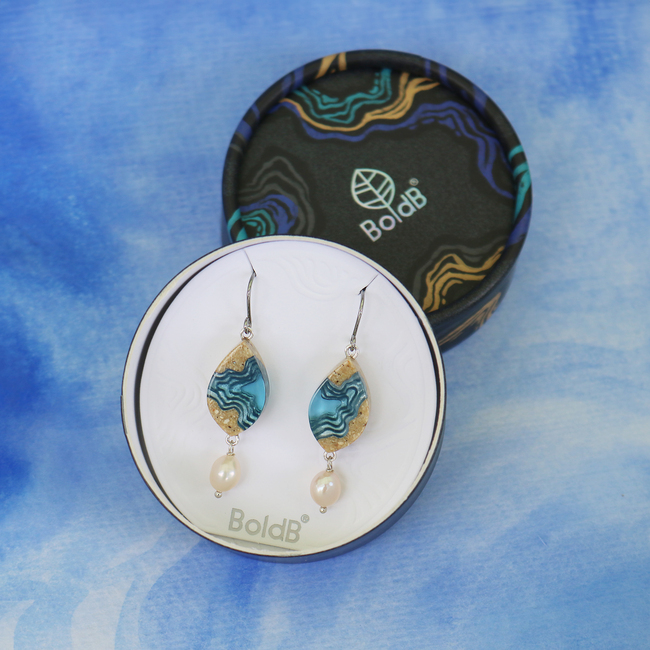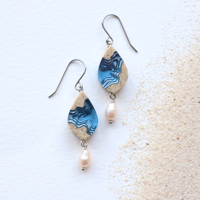Our Bay earrings feature a delicate leaf shape and have been crafted from bonded sand, aquamarine or ultramarine blue resin and silver metal pigments covering the fine topographic layers of the earrings. An elegant freshwater pearl with a slightly peachy/pink luster dangles below each earring to complement the design. Small eye-pins connect each earring to an allergy-friendly stainless steel french hook.