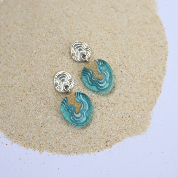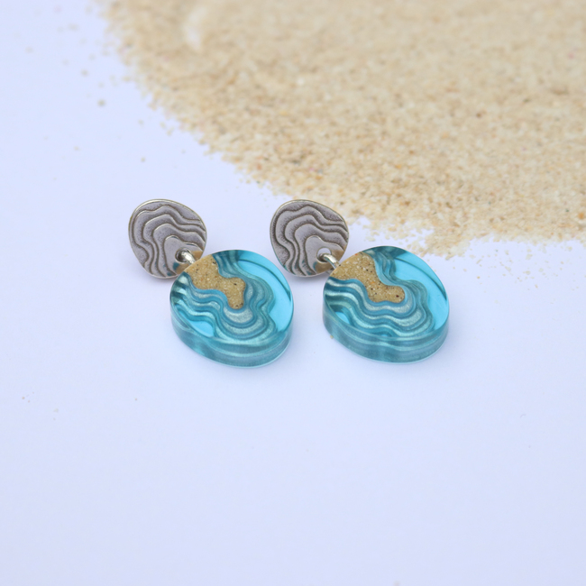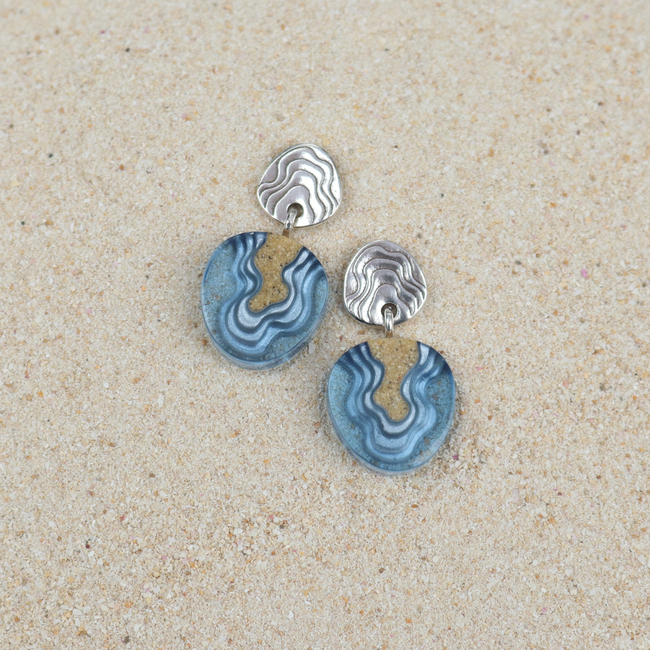 Our Cape earrings are carefully crafted from bonded sand combined with blue resin, emulating the geographic shape of a cape protruding into the ocean. Each earring dangles on an allergy-friendly stainless steel ear post featuring delicate topographic lines.