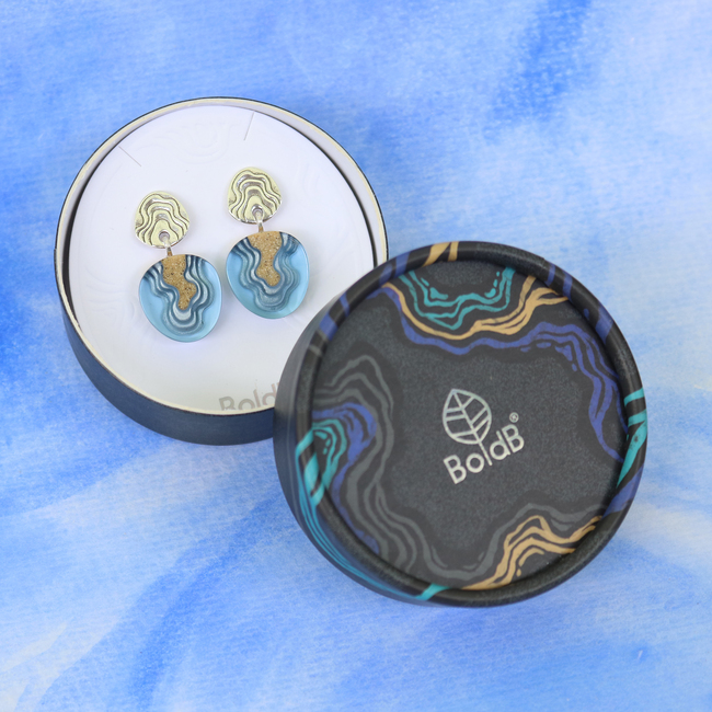 Our Cape earrings are carefully crafted from bonded sand combined with blue resin, emulating the geographic shape of a cape protruding into the ocean. Each earring dangles on an allergy-friendly stainless steel ear post featuring delicate topographic lines.&nbs...