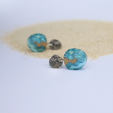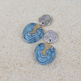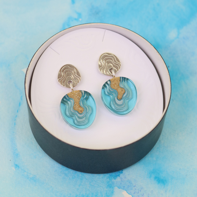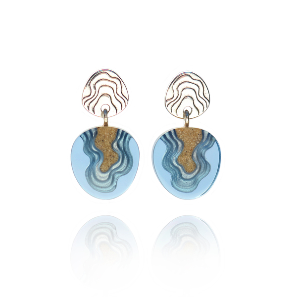 Our Cape earrings are carefully crafted from bonded sand combined with blue resin, emulating the geographic shape of a cape protruding into the ocean. Each earring dangles on an allergy-friendly stainless steel ear post featuring delicate topographic lines.