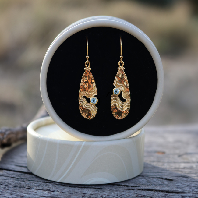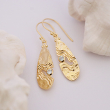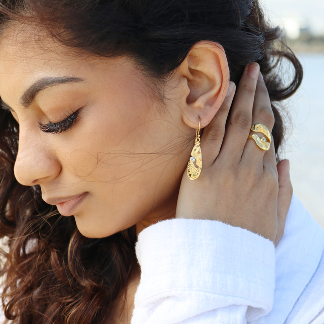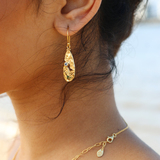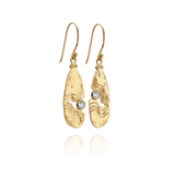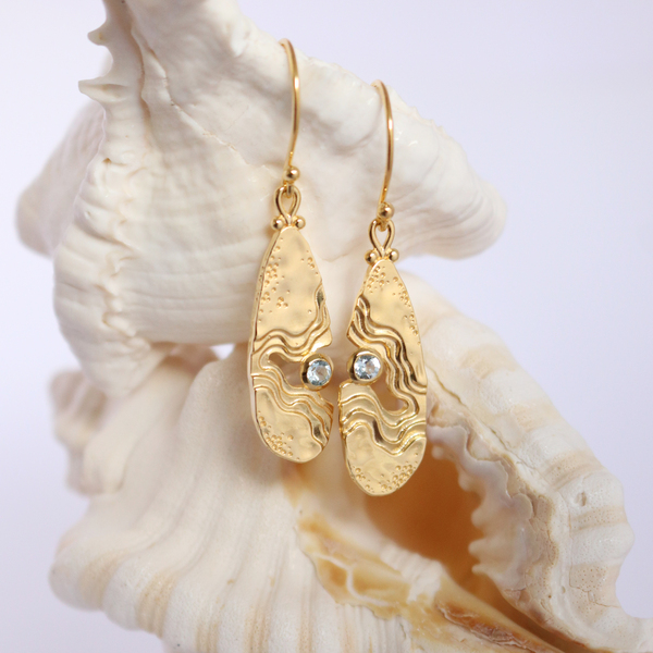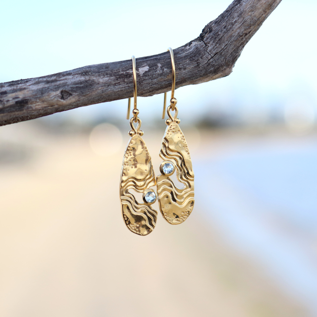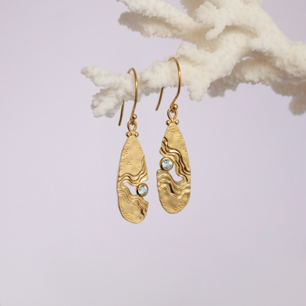 The Serenity Collection draws inspiration from the serene beauty of the ocean and its shores. Our Haven dangle earrings have been carefully crafted by Balinese silversmiths from environmentally friendly recycled 925 sterling silver with 18K gold plating. Each earring features a beautiful light blue Topaz gemstone, evoking the shimmering essence of water.