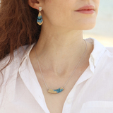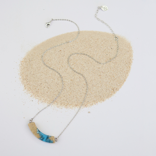 Our Headland necklace features a bold, slightly arched design with layered textures that evoke the topography of two land masses jutting into the ocean. Crafted from bonded beach sand and blue resin, the pendant hangs from a 16”/40cm cable link chain, complete with a 2”/5cm extender for an adjustable fit.