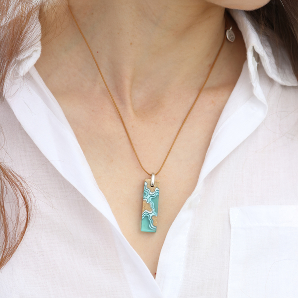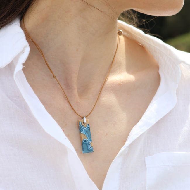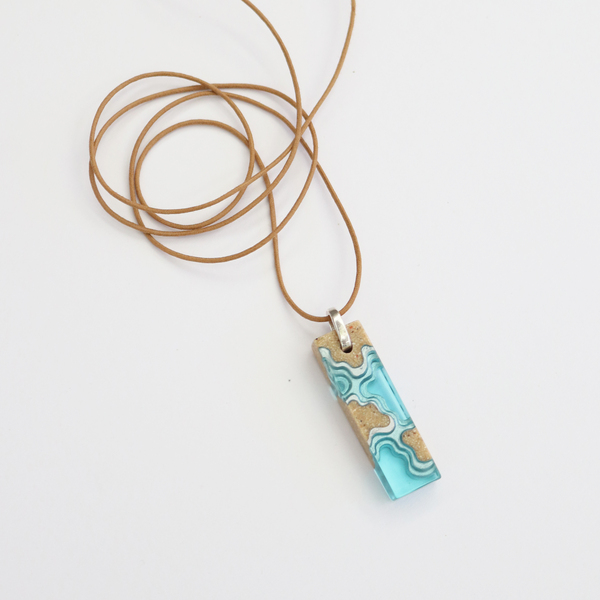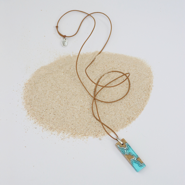 Our Islands necklace showcases a long rectangular pendant with layered textures that evoke the topography of three nearby islands, inspiring its name. Made from bonded beach sand and blue resin, the pendant is suspended on a handcrafted hook, attached to a caramel brown cord with a sliding knot for adjustable length. The cord can be extended up to a maximum length of 28”/70cm.