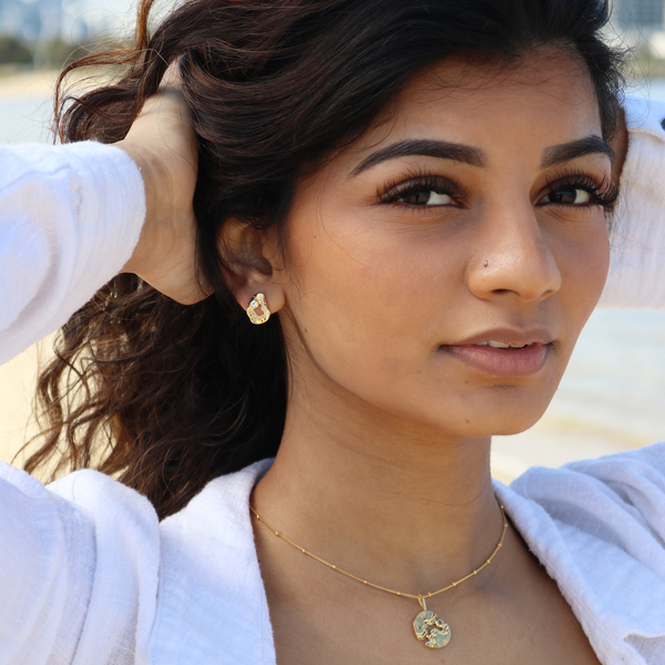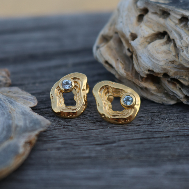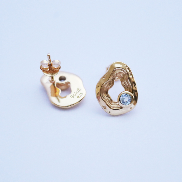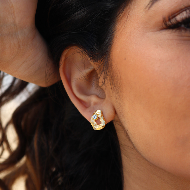 The Serenity Collection draws inspiration from the serene beauty of the ocean and its shores. Our Oasis ear studs have been carefully crafted by Balinese silversmiths from environmentally friendly recycled 925 sterling silver with 18K gold plating. Beautiful light blue Topaz gemstones aim to resemble the shimmering essence of water.