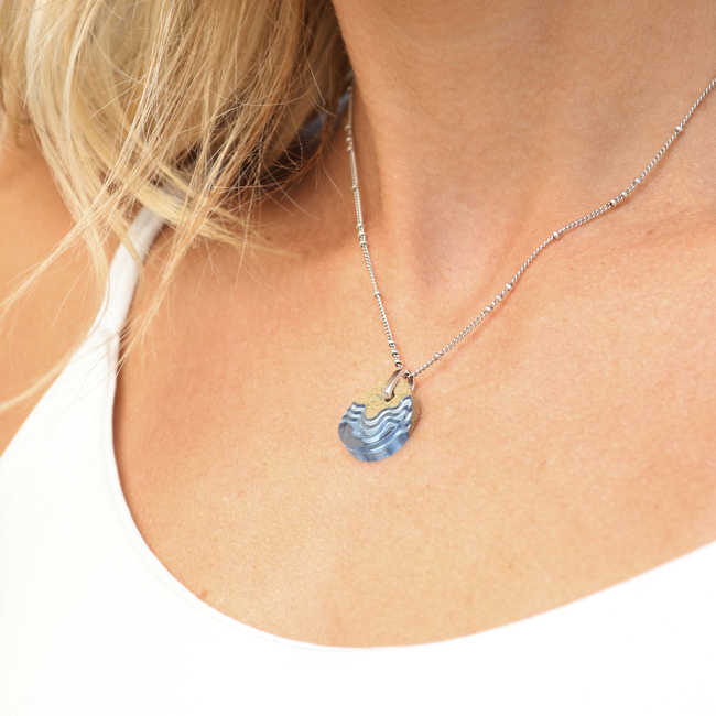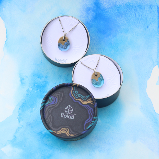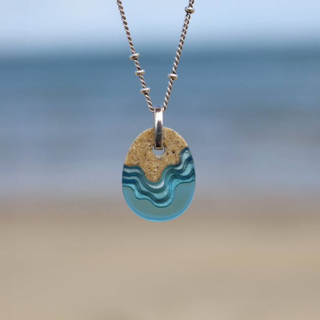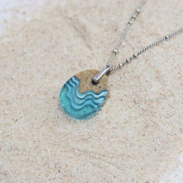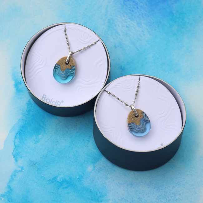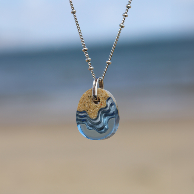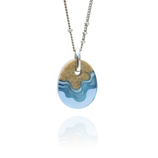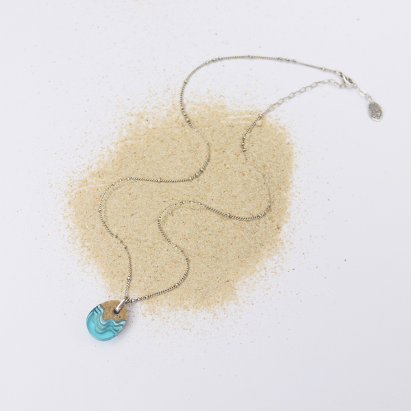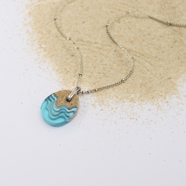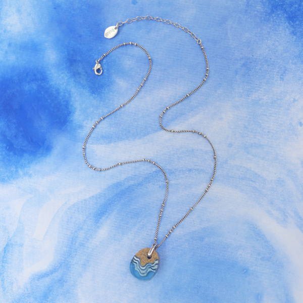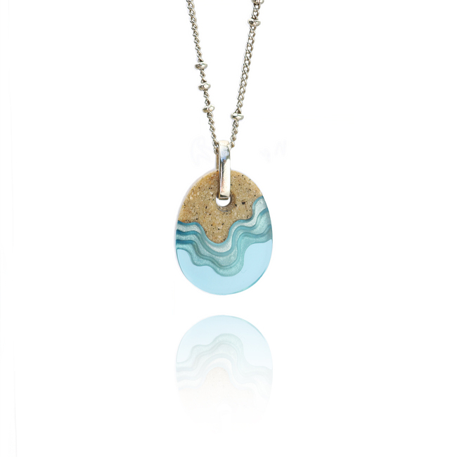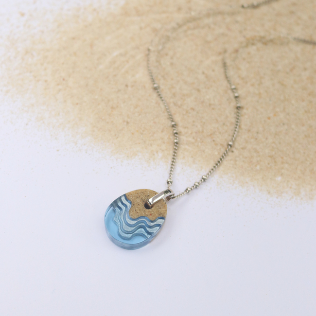 Our Oceanfront necklace is crafted from bonded sand and blue resin. Its delicate oval shape, adorned with intricate topographic layers, elegantly mirrors the natural contours of a coastline. The pendant dangles on a 16”/40cm cable link chain with small metal balls. A 2”/5cm extender with our leaf logo enables you to adjust the length.
