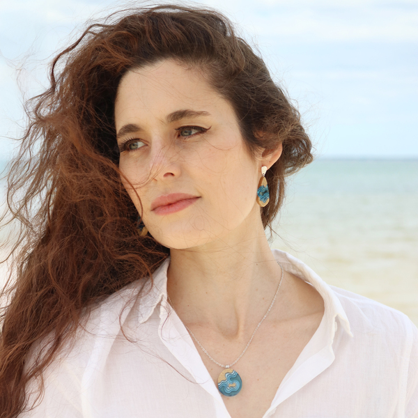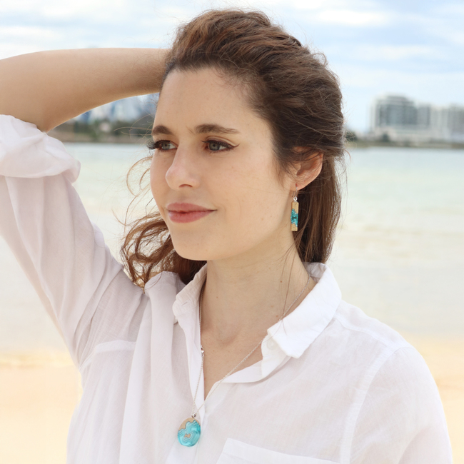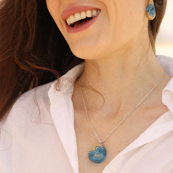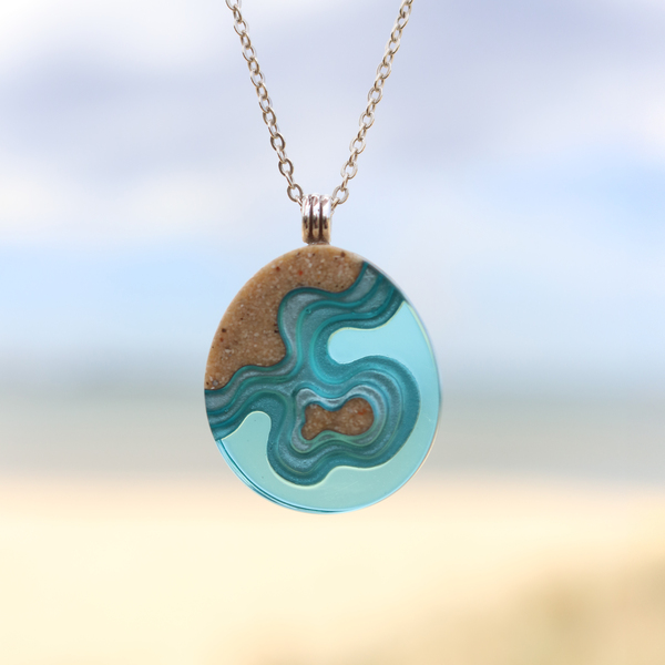 Our Promontory necklace showcases a wide tear drop shaped design, with layers that mimic the topography of a Promontory pertruding into the ocean. The necklace is carefully crafted from bonded beach sand and blue resin and dangles on an 20”/50cm cable link chain with a 2”/5cm extender.
