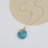 Our Promontory necklace showcases a wide tear drop shaped design, with layers that mimic the topography of a Promontory pertruding into the ocean. The necklace is carefully crafted from bonded beach sand and blue resin and dangles on an 20”/50cm cable link chain with a 2”/5cm extender.