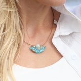 Inspired by reef formations, this design showcases a delicate ark shape crafted from bonded sand and aquamarine blue resin, accentuated by silver metal pigments that highlight its intricate topographic layers. The unique design is complemented by a pale blue amazonite gemstone. Two eye pins connect the pendant to a caramel brown cord, which features sliding knots for adjustable length, extending up to 30"/76cm.
