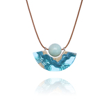 Inspired by reef formations, this design showcases a delicate ark shape crafted from bonded sand and aquamarine blue resin, accentuated by silver metal pigments that highlight its intricate topographic layers. The unique design is complemented by a pale blue amazonite gemstone. Two eye pins connect the pendant to a caramel brown cord, which features sliding knots for adjustable length, extending up to 30