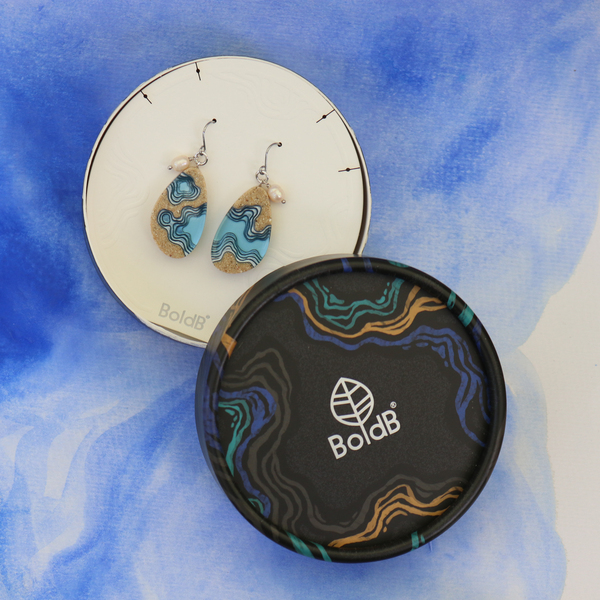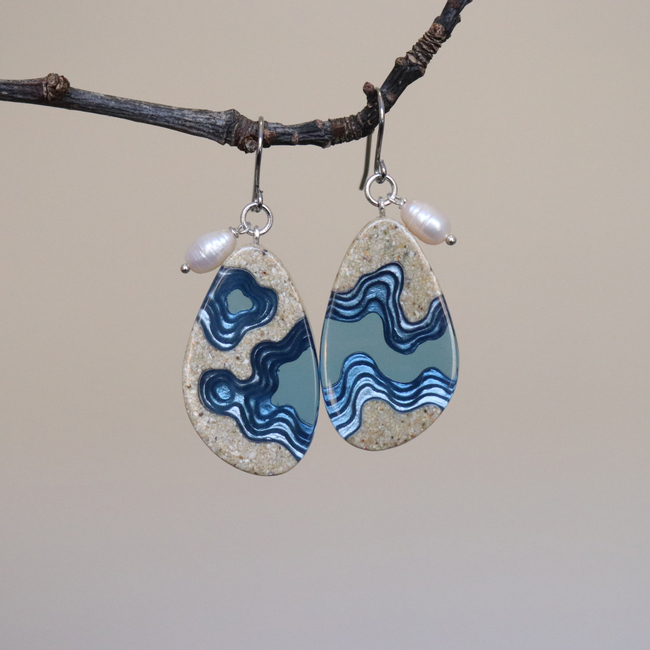 The Rockpool earrings are the largest earrings from our Aqua collection and ideal for those who love to make a statement. They feature a unique asymmetrical tear drop shape and have been crafted from bonded sand, blue resin and silver metal pigments covering the delicate topographic layers of the earrings. Each earring features a delicate freshwater pearl with a beautiful slightly peach pink luster. The ear hooks are made from allergy friendly stainless steel.