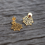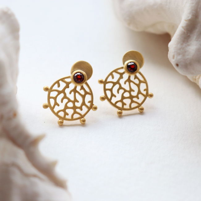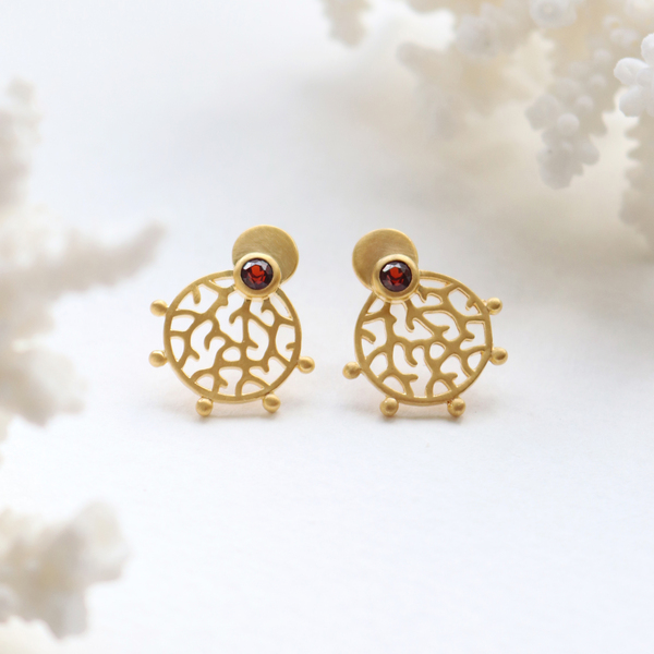 Our Roseni Stud Earrings have been named after the coral species Acropora Roseni and feature a compact round shape with branching coral patterns and a 3mm natural rich red garnet stone. Delicate metal balls decorate the boundary of the design. The ear studs have been crafted from sustainable recycled 925 sterling silver and 18K gold plated before being carefully hand bushed to an elegant matte surface finish.