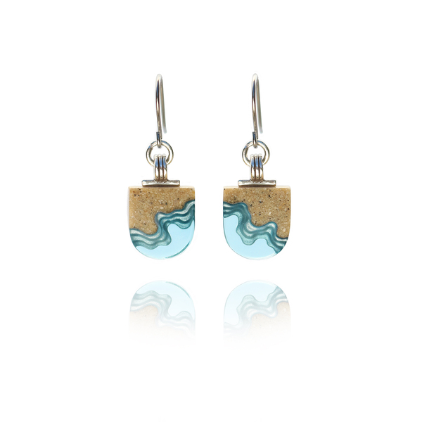 Our dainty Shoreline earrings feature a U-shaped design crafted from bonded sand and blue resin, resembling the shore and ocean. The earrings dangle on allergy-friendly stainless steel French ear hooks.